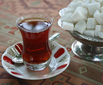 Role of tea in Turkish social life is astonishing. Tea is served almost anywhere you travel to including shopping centers, bazaars, public parks or streets. To brew their perfect cup of tea, Turks boil water first in a double tea pot. The top part of the tea pot contains the powered black tea while the bottom pot has the boiling water. With this method, it allows people to drink the tea as they wish; strong and steeped or light with more water added. Tea is poured in small tulip shaped glasses, Often, people have at least three glasses of tea with traditional Turkish biscuits or Turkish delight. Turks take pride in their methods of tea making and drinking. They do not use tea bags and prefer loose leave to make a more pure tasting tea. Although they use black tea, Turks makes sure that their final tea is a ruby red color. This color reflects their national flag color, their sport teams,and their love of culture and diversity. An old Turkish folk once stated that "conversations without tea are like a night sky without the moon". Tea is vital in Turkey and the citizens hold great pride and joy for the beverage everyday.